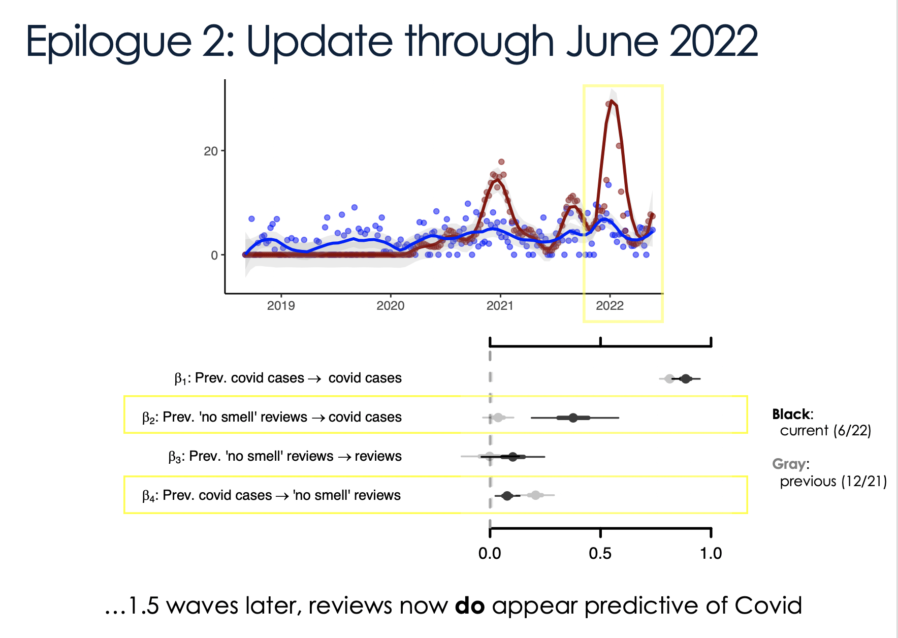Abstract Paper Poster Video Data Update 6/1/22: reviews now predict cases Update 10/10/22: reviews rising, cases falling