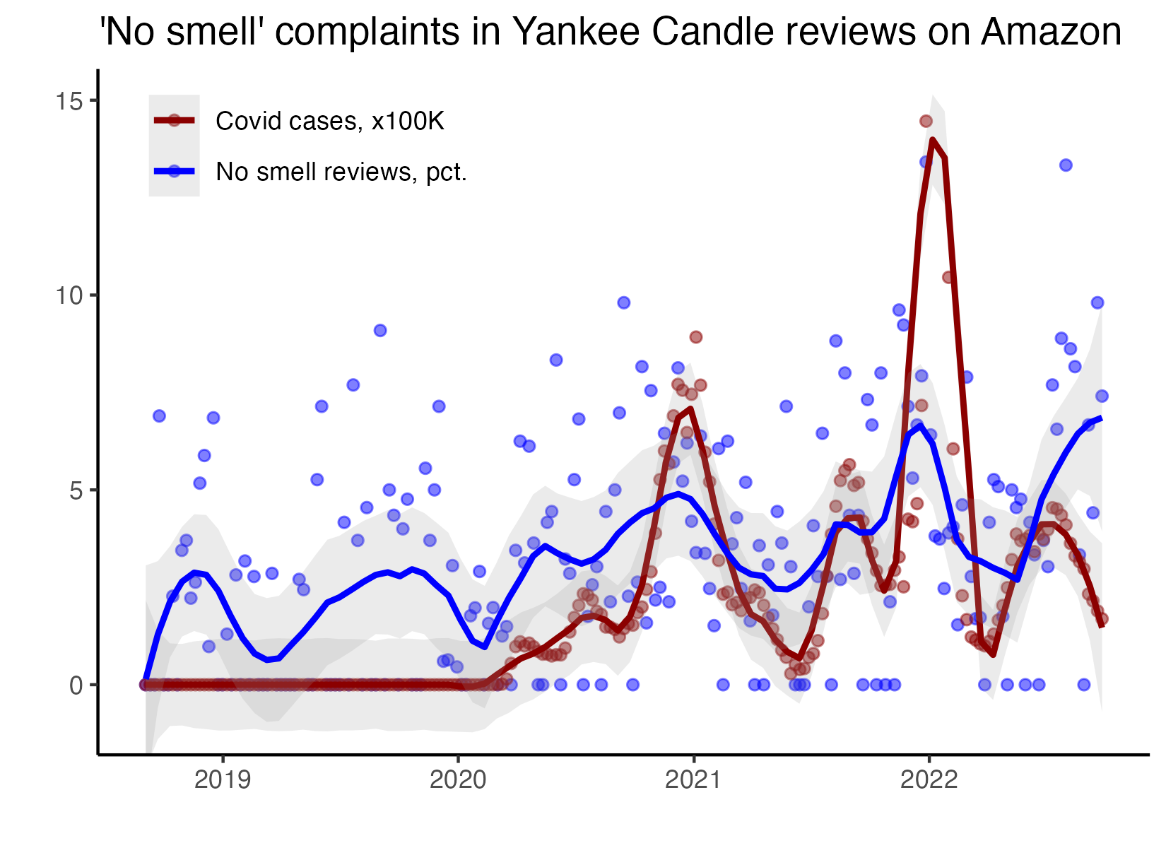 'Zero scent': could negative reviews of smelly candles hint at a Covid surge?, The Guardian; Customers are Flooding Yankee Candle's Amazon reviews with claims that the candles have no scent, but the surge in Omicron cases may be to blame Business Insider; Well, People Can't Smell their Candles Again, Gawker; Hmm, Angry Reviews of Candles are Spiking Again, Input. 2021-2022.